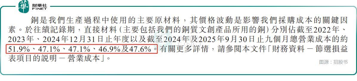 光鲜业绩背后,铜师傅也面临不少经营挑战。首当其冲的是原材料价格波动风险——铜是公司生产的核心原材料,直接材料成本占营业成本的比例长期维持在47%左右。而近年铜价持续上涨,从2019年的每吨4.76万元飙升至2024年的7.50万元,2024年5月更是创下每吨8.86万元的历史峰值,截至2025年9月末仍高达每吨8.31万元。
