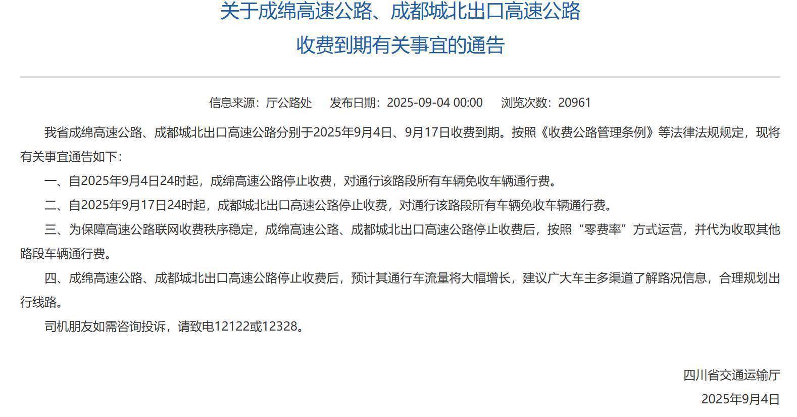 《通告》写道,四川省成绵高速公路、成都城北出口高速公路分别于2025年9月4日、9月17日收费到期。按照《收费公路管理条例》等法律法规规定,自2025年9月4日24时起,成绵高速公路停止收费,对通行该路段所有车辆免收车辆通行费。自2025年9月17日24时起,成都城北出口高速公路停止收费,对通行该路段所有车辆免收车辆通行费。