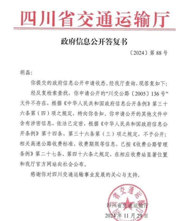 2024年11月29日,四川省交通运输厅《政府信息公开答复书》显示,胡磊申请的相关信息,文件中含有涉密信息,依法已定密,根据规定不予公开。胡磊不服,申请行政复议。2025年3月6日,四川省政府出具《行政复议决定书》,称在疫情防控期间车辆通行,交通运输部等国家部委于2020年开始向各地下发相关通知,要求各地根据实际情况依法保障收费公路车辆通行。依据上级通知,经四川省政府同意,四川省交通运输厅于2024年3月制发了重新确定成锦、城北出口高速公路收费截止日期的通知。经本机关审查,上述相关文件均严格按照我国《保守国家秘密法》关于定密要求,确定密级为“秘密”,保密期限为“长期”。