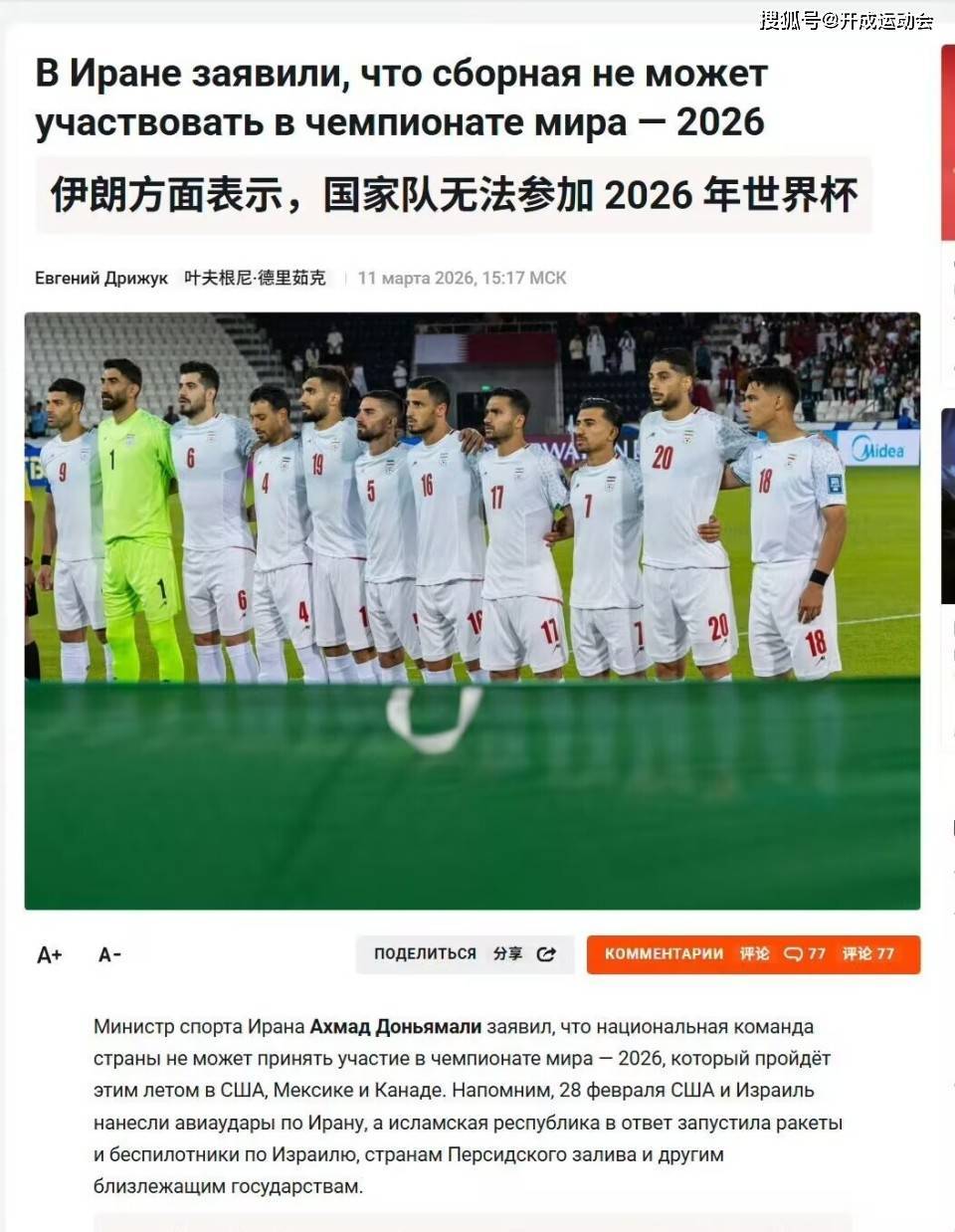 3月11日,伊朗体育部部长杜尼亚马利表示:目前情况非常复杂,这种局面之下,伊朗男足无法前往美国参赛,退出世界杯是最好的选择!
