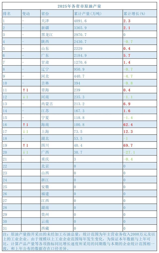 天津蝉联第一,去年原油产量突破4000万吨,同比增长2.3%至4091.6万吨。渤海油田是我国海上最大油田,也是全国第一大原油生产基地,2025年累计生产油气当量突破4000万吨,创历史新高。